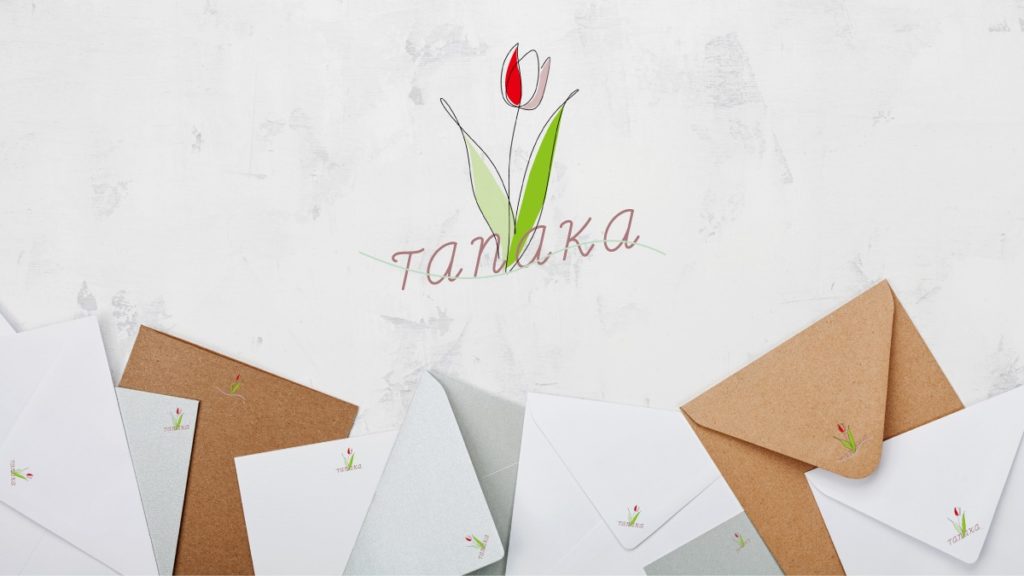 緑の曲線は伸びた根、名前はベージュの色で土を表現しそこからチューリップが伸びたような遊びごころを入れてあります。